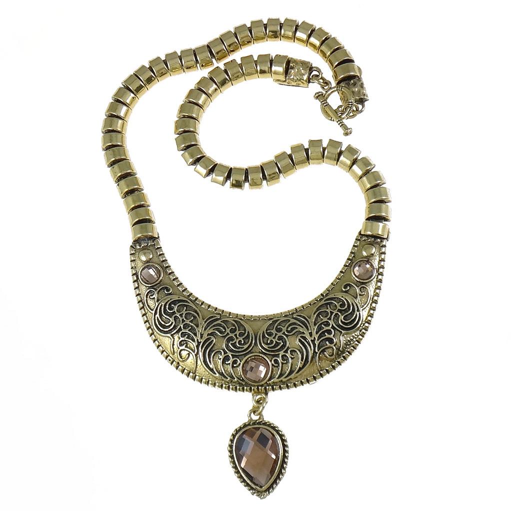 Gold tone statement necklace featuring high-relief filigree scroll with three faceted rhinestones and large rhinestone pendant with wide cocoon chain and toggle clasp.