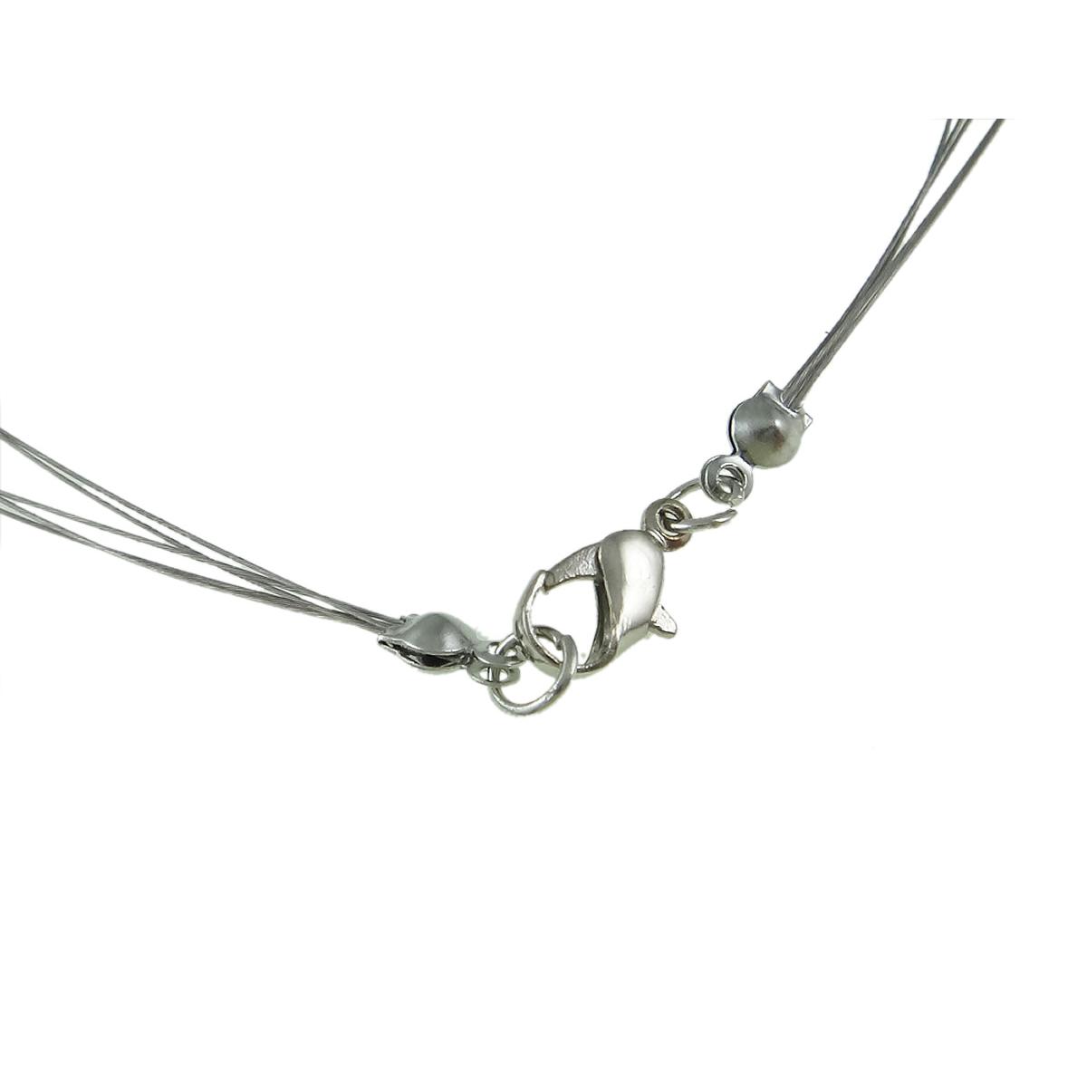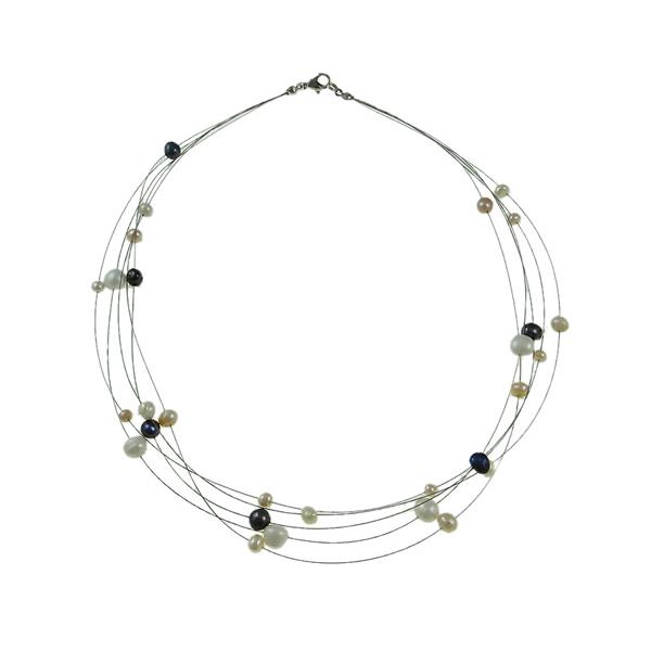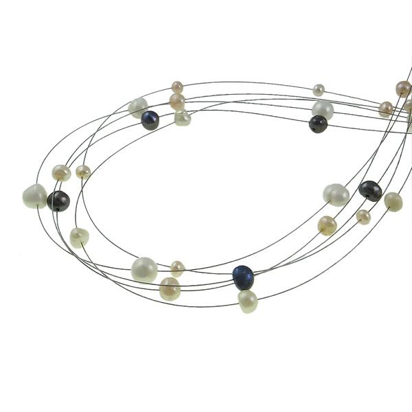 Five-strand solid steel wire Illusion Necklace with mixed black, pink and white freshwater pearls of varied forms and sizes.