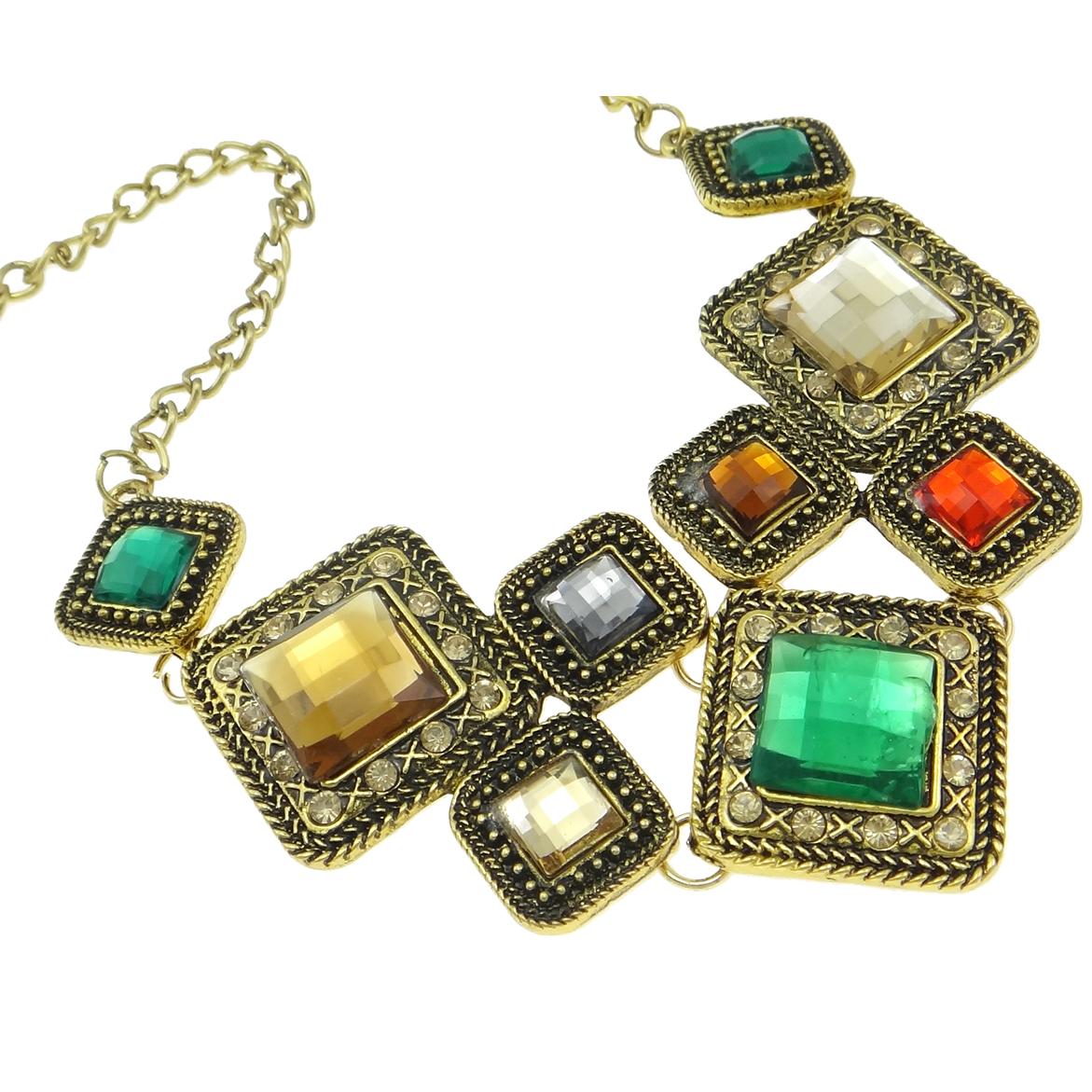 Gold tone bib necklace featuring a cluster of faceted resin cabs, some with rhinestone framing, in multiple colors.