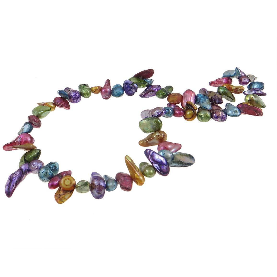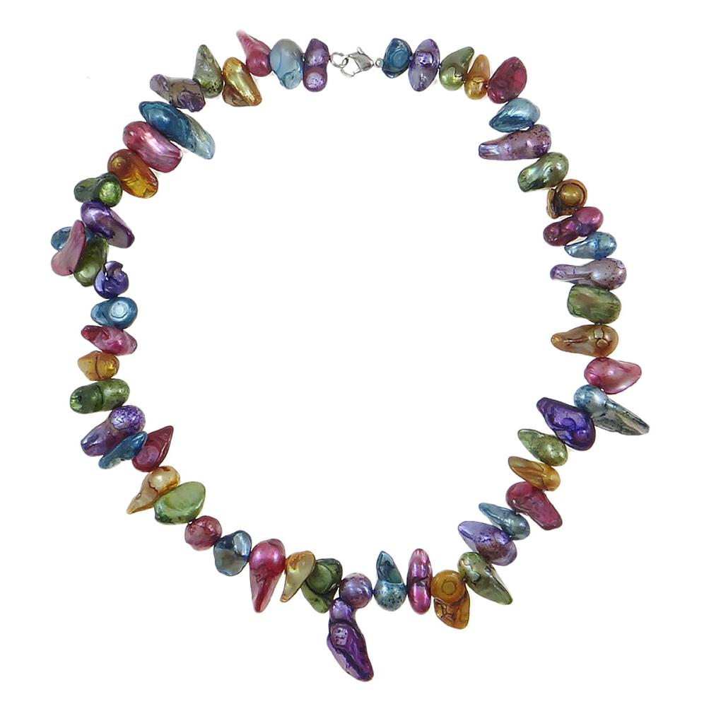 Hand-strung necklace of mixed, dyed Freshwater Baroque Pearls with silver tone lobster claw clasp.