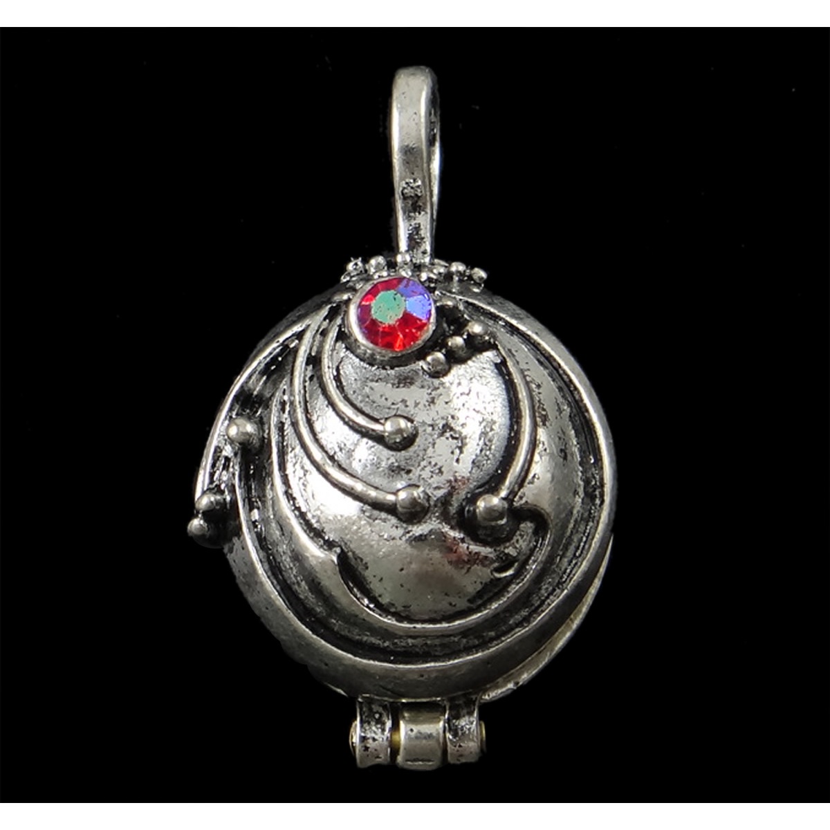 Solid silver tone metal pendant with fabulous, Gothic design high-relief decoration. Magnetic clasp at back with iridescent AB pink rhinestone accent at front. Reproduction of pendant from Vampire Diaries series.