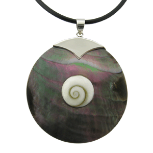 Fine, mother-of-pearl abalone shell with inlaid spiral shell on solid sterling silver (marked 925) bezel.