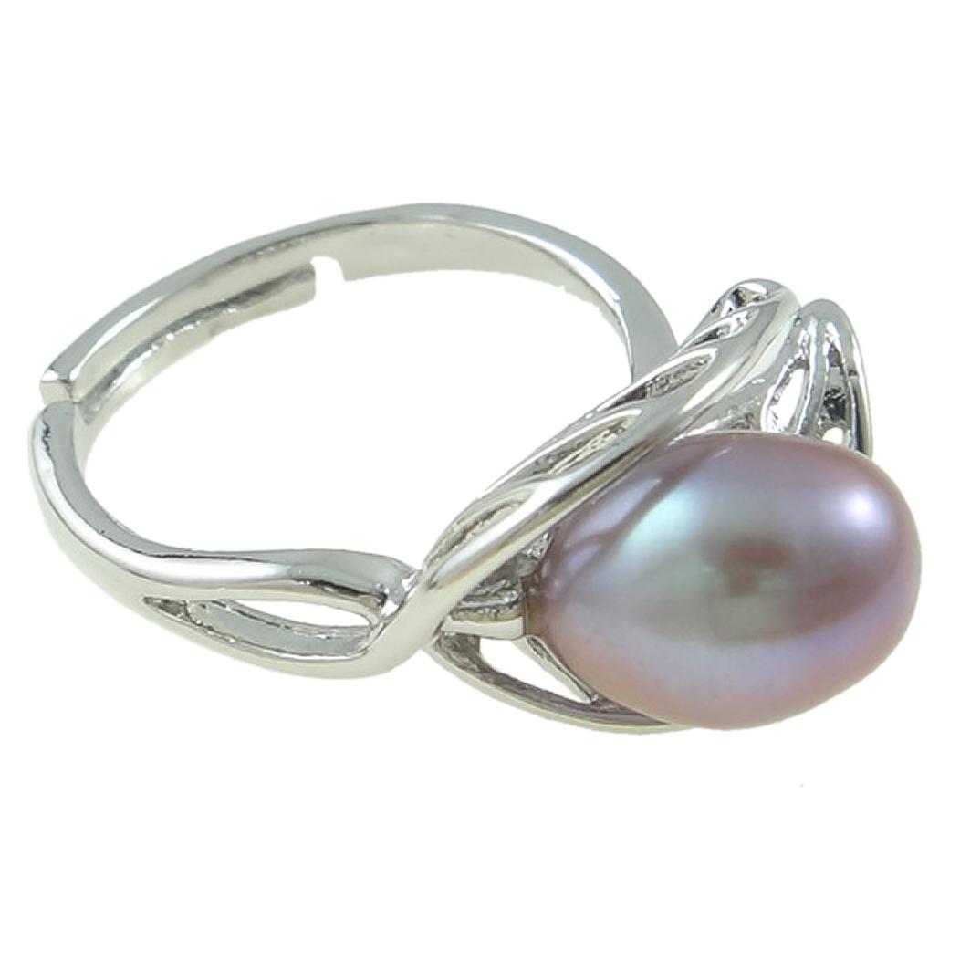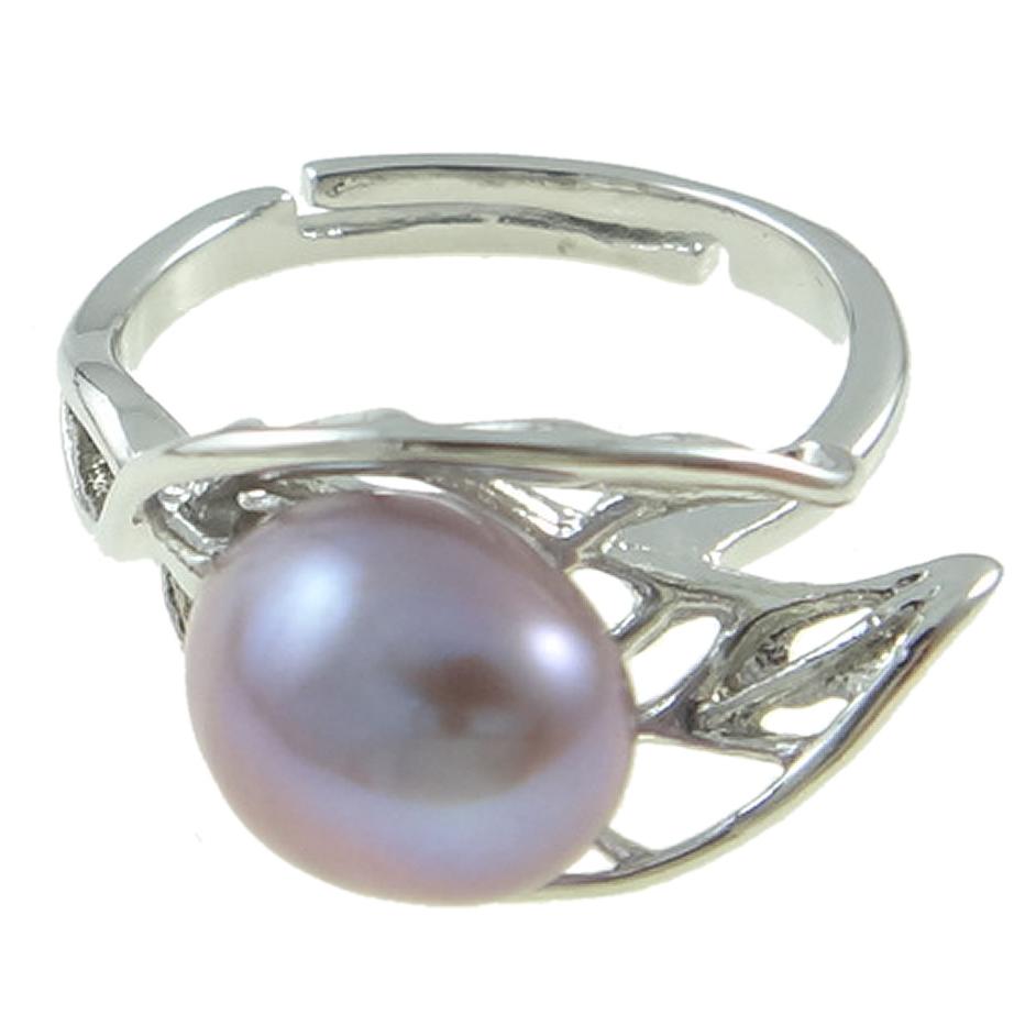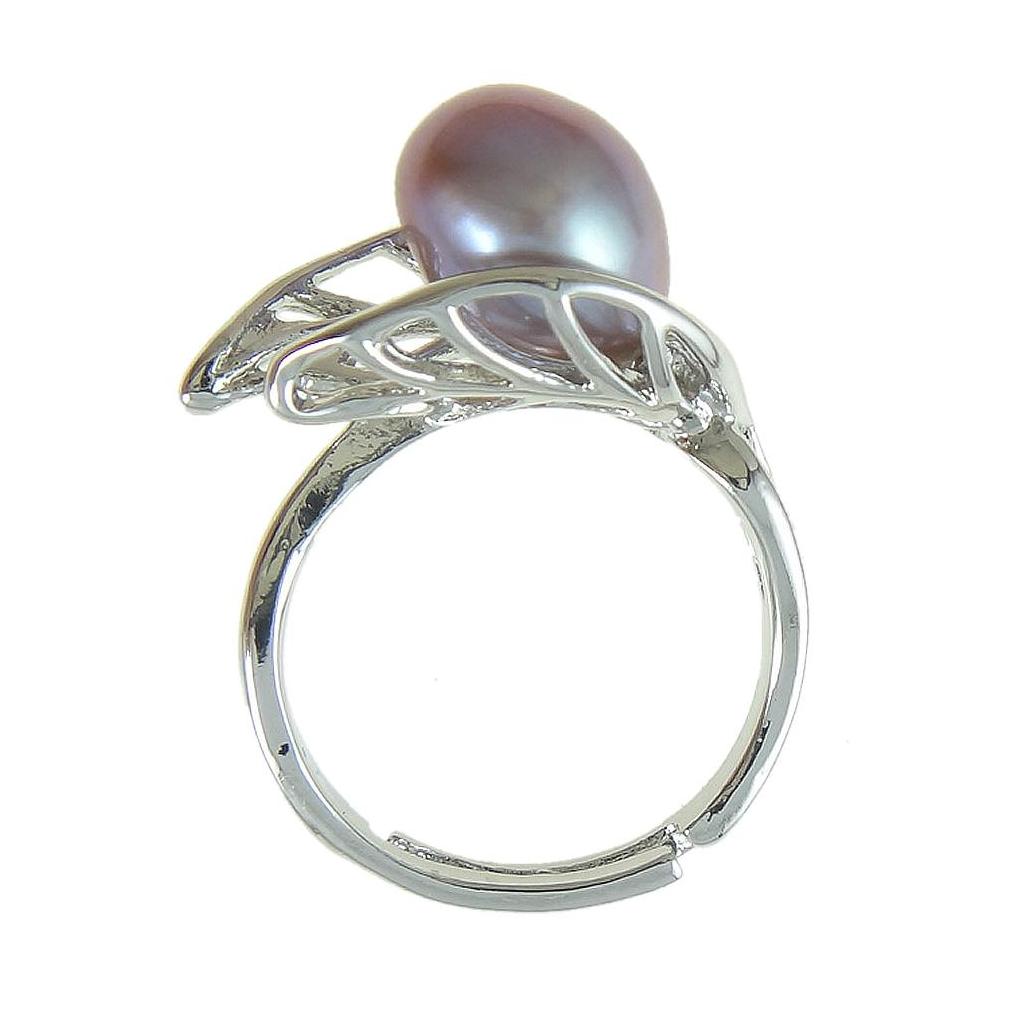 Adjustable, silver tone ring featuring a large, freshwater pearl settled between two leaf silhouette.