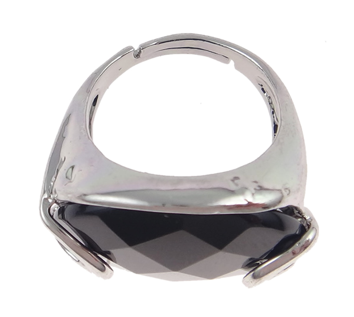 Adjustable, silver tone rings featuring varied, faceted stones with stylized oval overlay.