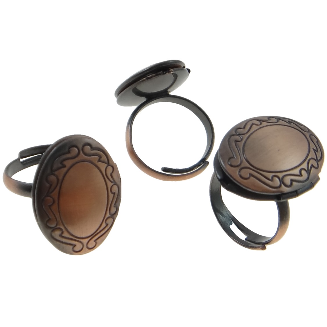 Copper tone solid metal ring featuring a locket top with inscribed scroll. Dimensions: 5/8" x 7/8"; adjustable size 6 1/2 to 9 1/2.