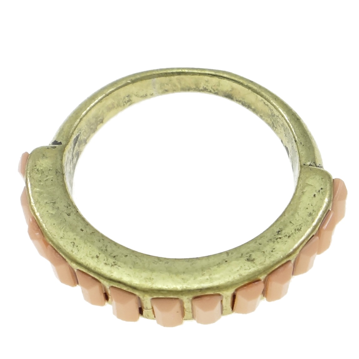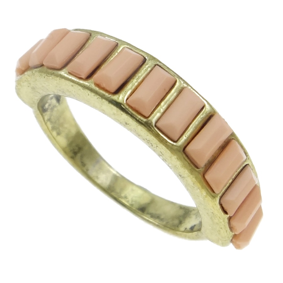 Gold tone metal rings in an Art Deco style with 13 inset, faceted pink rectangular cabs.