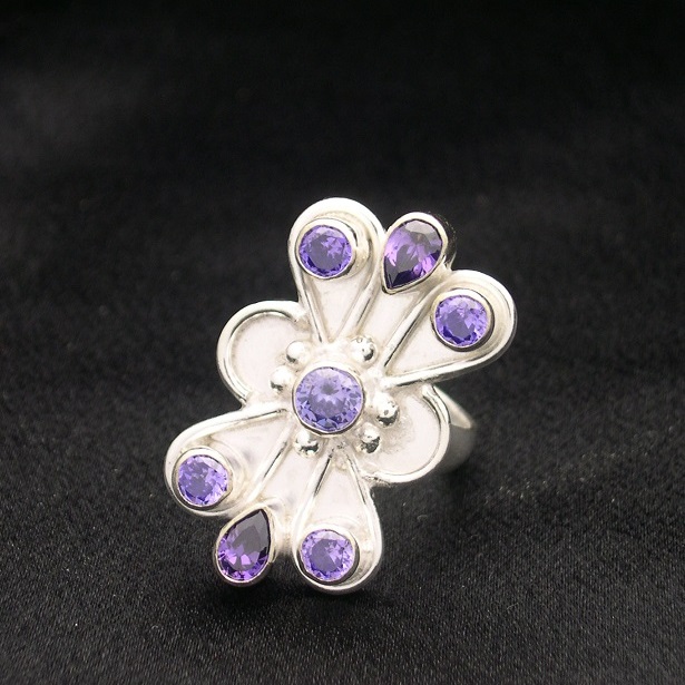 Ring made of Sterling Silver with genuine, faceted Green Peridot gemstones in a large, cocktail presentation with beading.