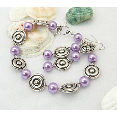 Matching set consisting of bracelet and earrings with violet glass pearl beads and Tibetan silver bullseye beads.