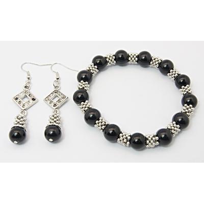 Demi-parure set consisting of Black Onyx gemstone stretch bracelet with Tibetan silver spacers and coordinating pair of earrings. Dimensions: Bracelet 2 1/8" internal diameter that stretches to fit most wrists; 2 1/3" earrings.