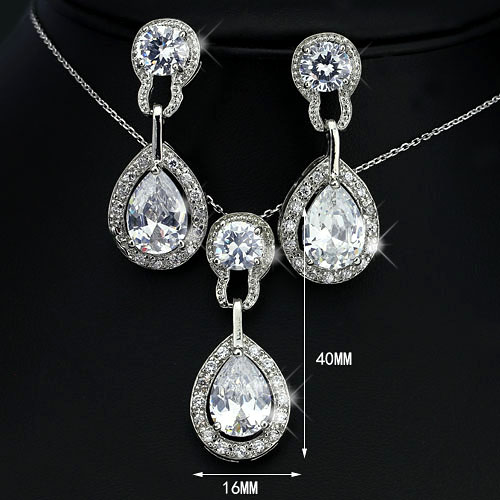 High quality necklace and earrings set featuring silver-plated brass with large, pear-cut White CZ stones and inset white rhinestone accents.